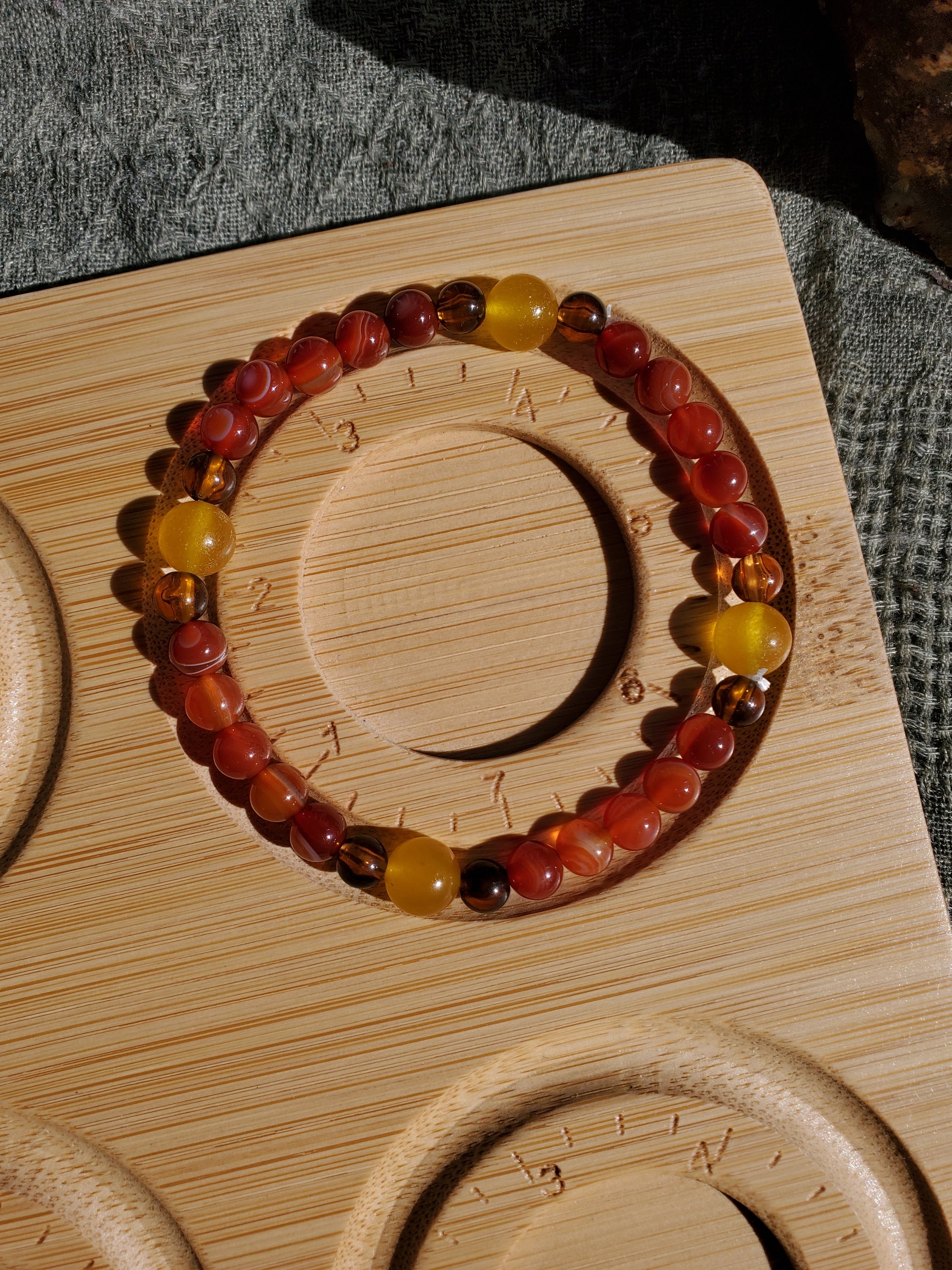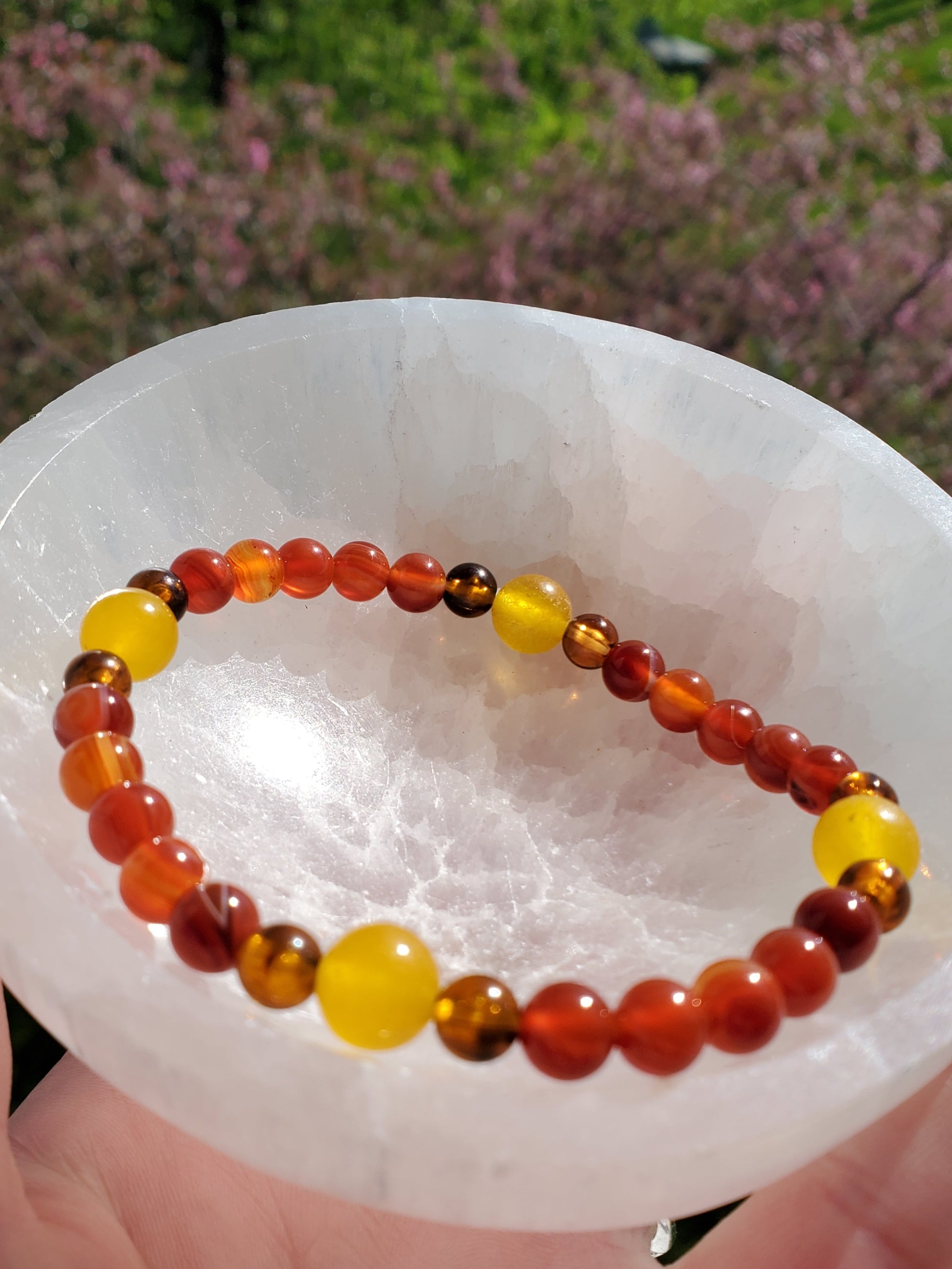 Warming colors and grounding energy - the combination of amber, carnelian, and jade keeps you connected to mother nature, while allowing you to express confidence with ease.
