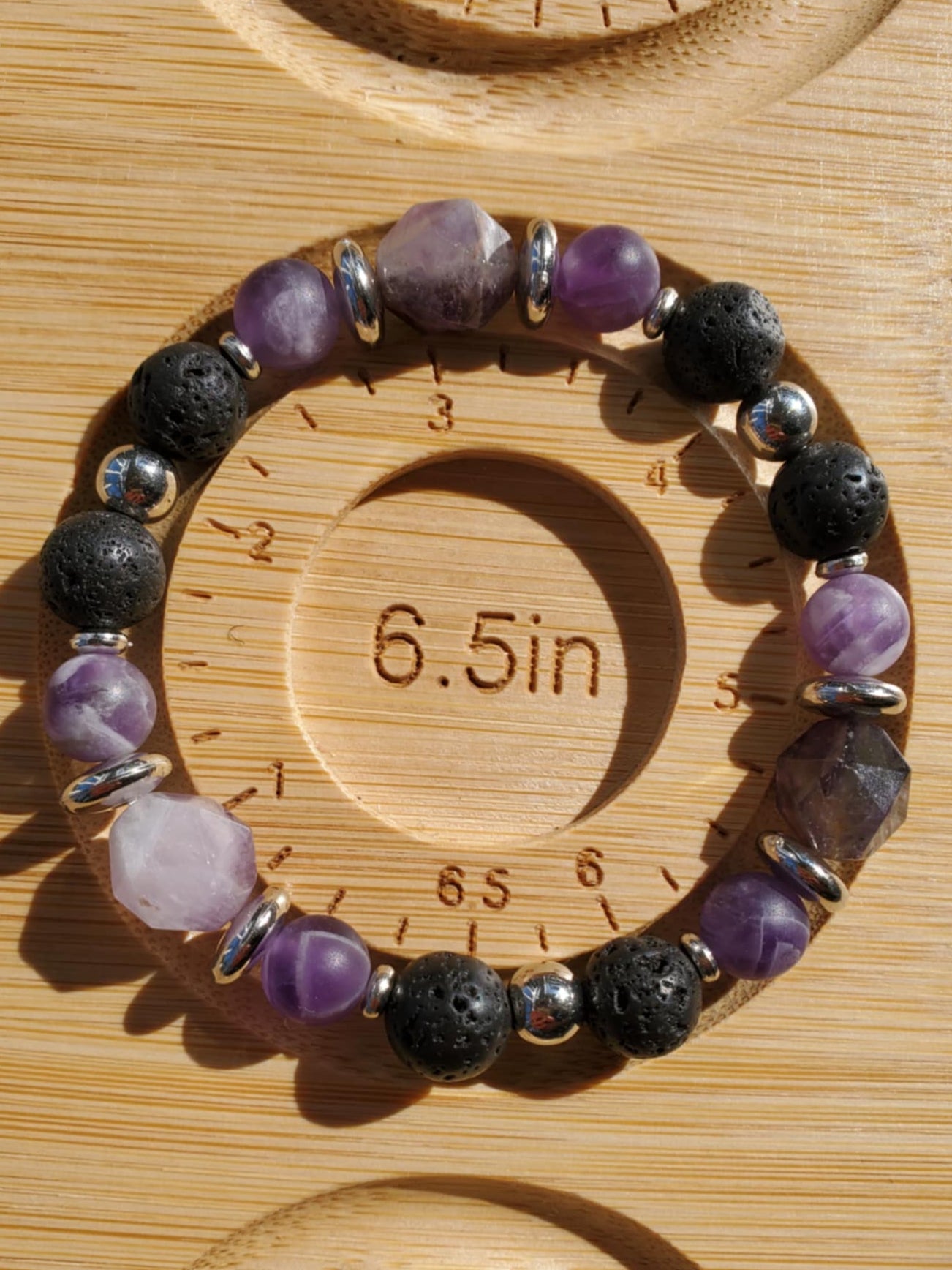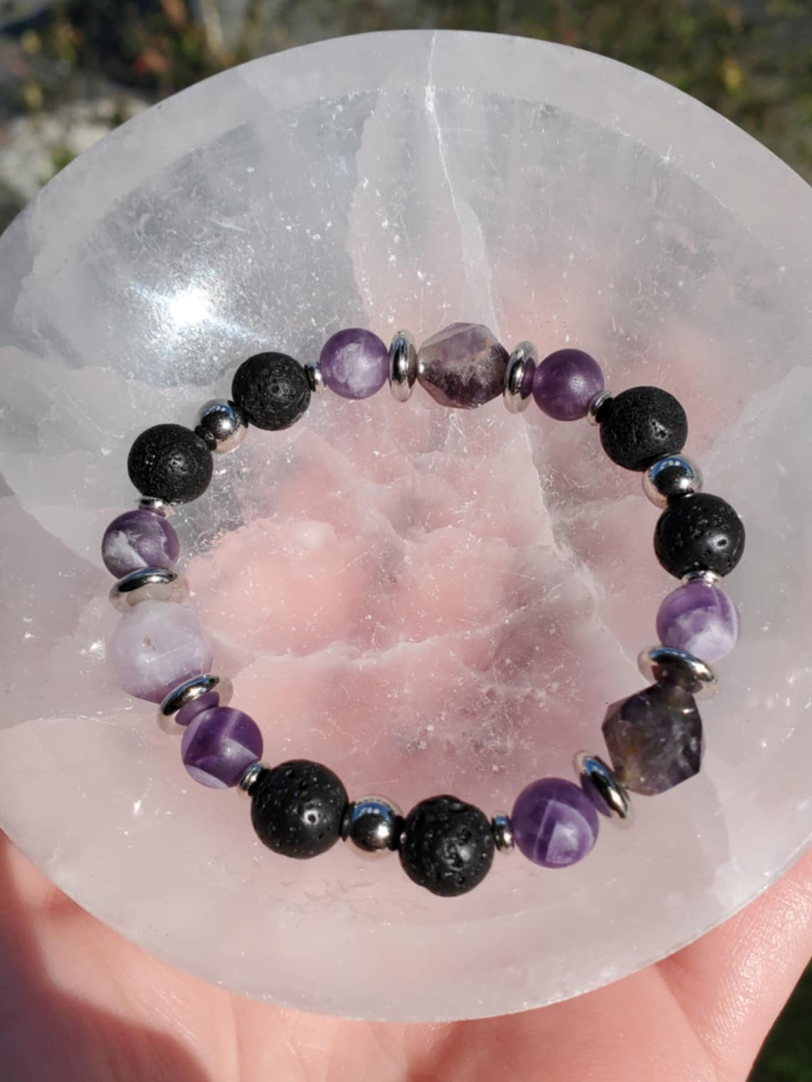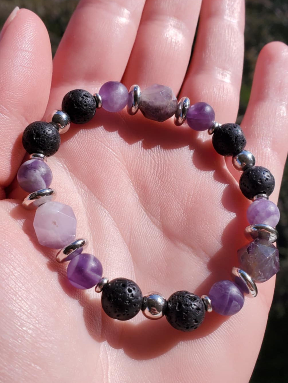 Purple, black and silver - a classic and sleek look. The lava stone is great for using with essential oils (just drop onto the stone). Amethyst is a calming & healing stone, bringing the wearer upward in energy. Chevron amethyst specifically is used often in the dream realm.