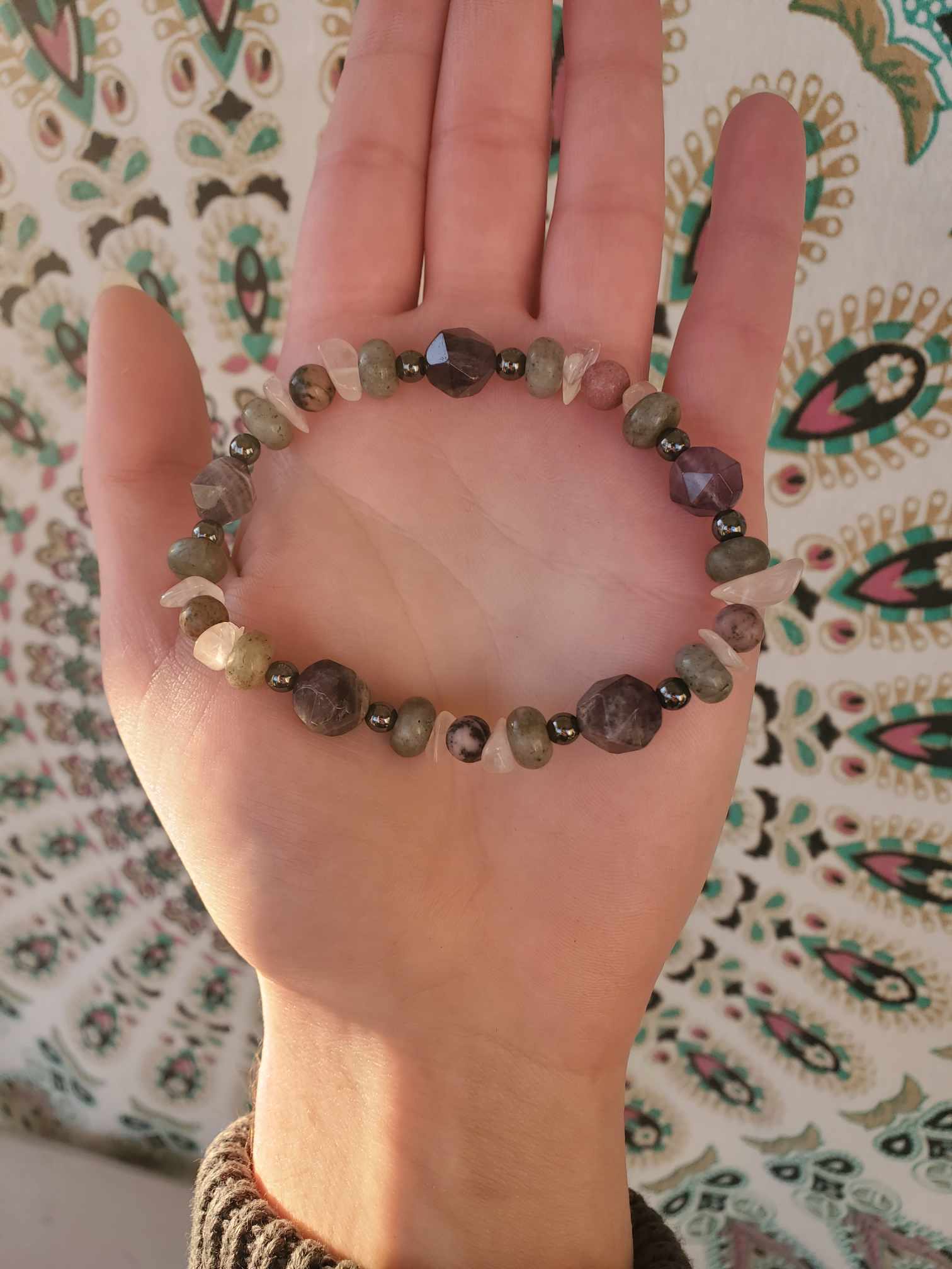 This gorgeous, healing (amethyst), & calming combination is excellent for someone going through a tough change, in need of some emotional (rhodonite) & mental (labradorite) TLC (rose quartz). In order to heal properly, one must feel safe & protected (hematite). Nurturing & cooling energies.