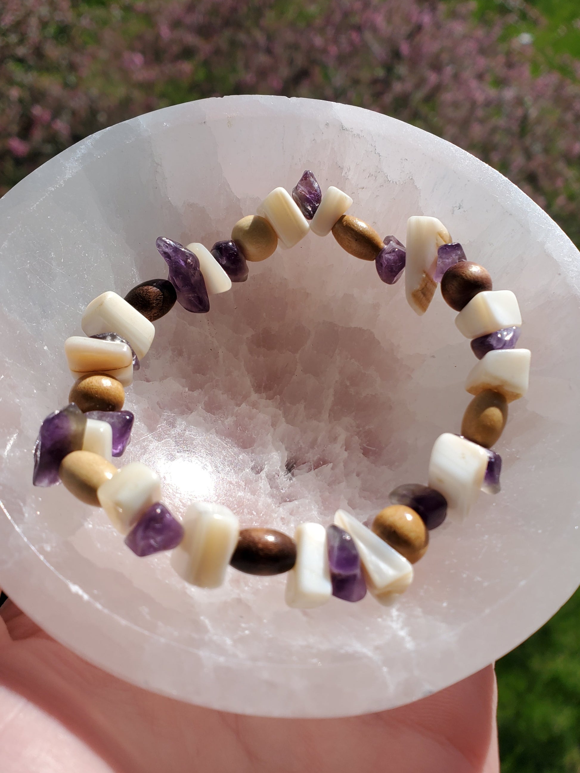 Earth, water & spirit is easily connected to when you are open to receiving. May the wood ground you, the shell help you flow, and the amethyst to crown you into your highest state of existence. This combination is balancing & enlightening.