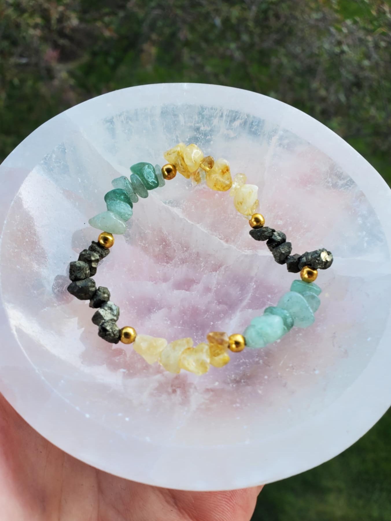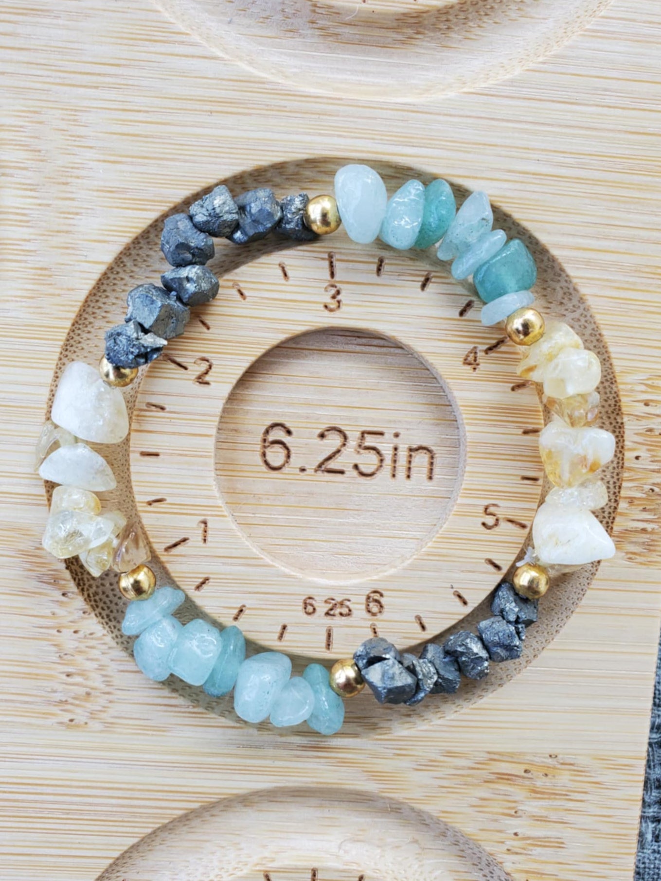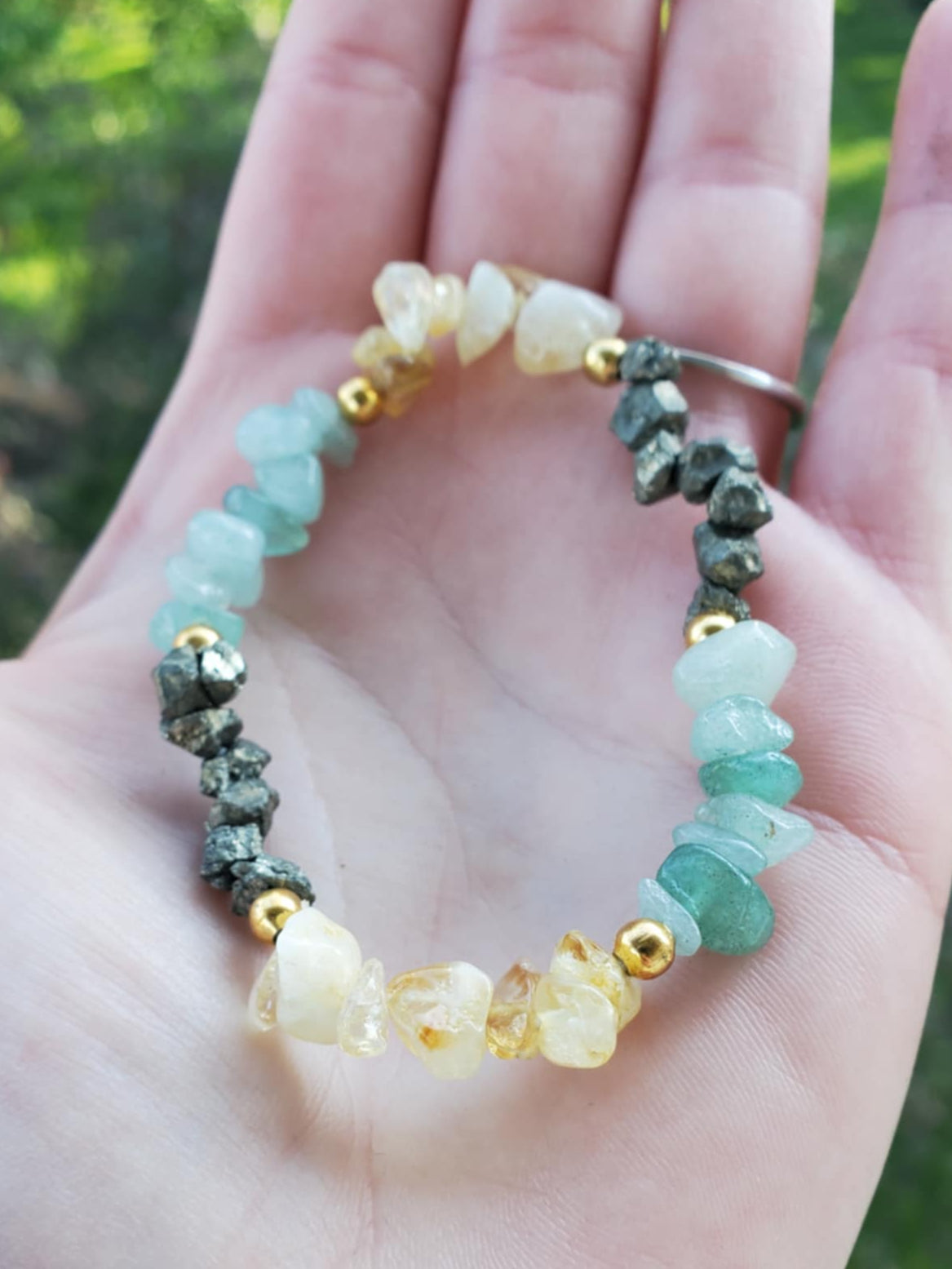 A sun-loving combination (pyrite & citrine) cooled off with a splash of aventurine. Gold accents make the warm & cool colors pop!