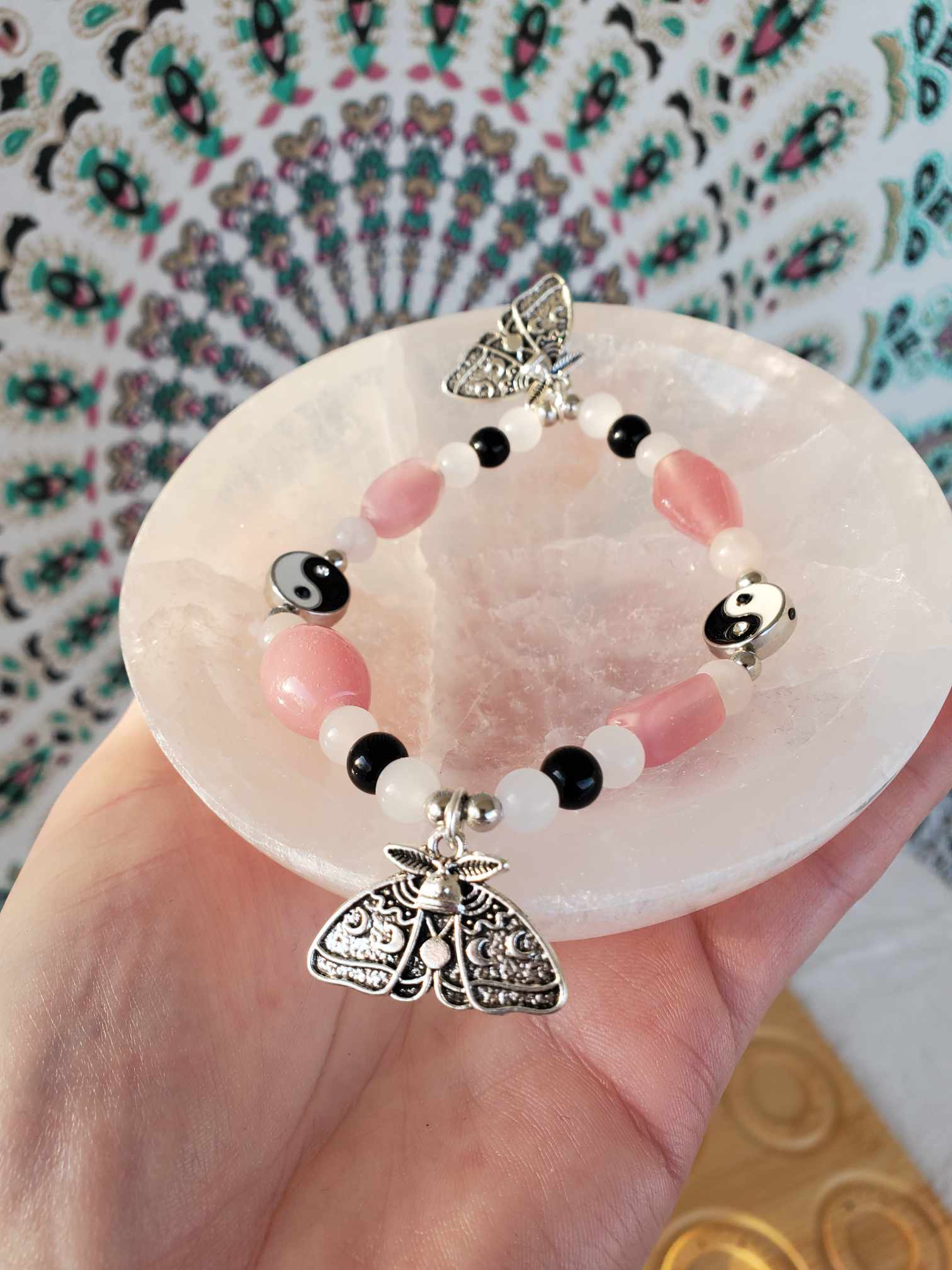 Maintaining balance through transformation requires patience and self-understanding. I crafted this with rose quartz for love, obsidian for protection & grounding. The moth & moon phases remind you to be comfortable with change. Yin-Yang reminds you to stay balanced.