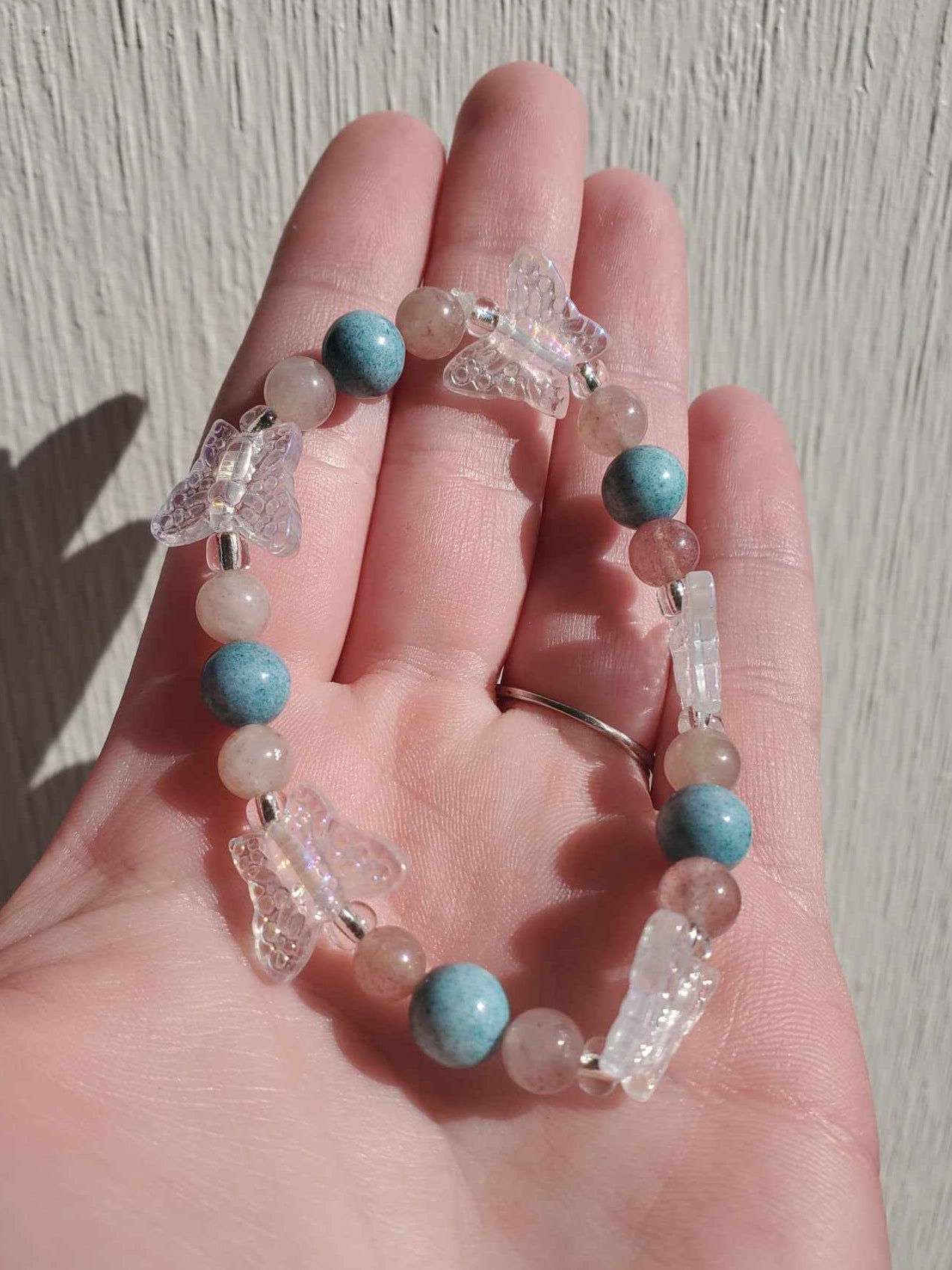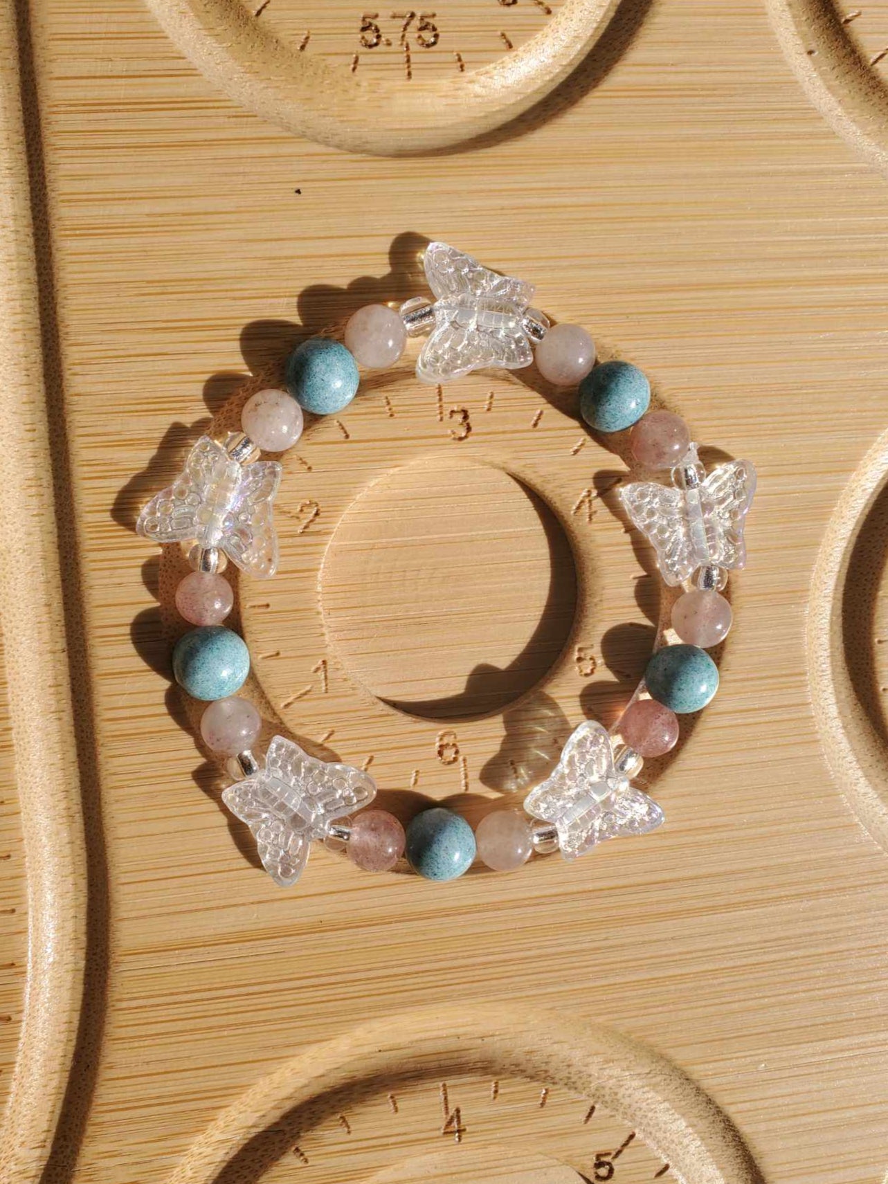 Strawberry quartz is a very reassuring and healing stone; amazonite is nurturing and calming. Emotional balance is closer with this combination of crystals. Butterflies are symbols of change, transformation, and letting go.