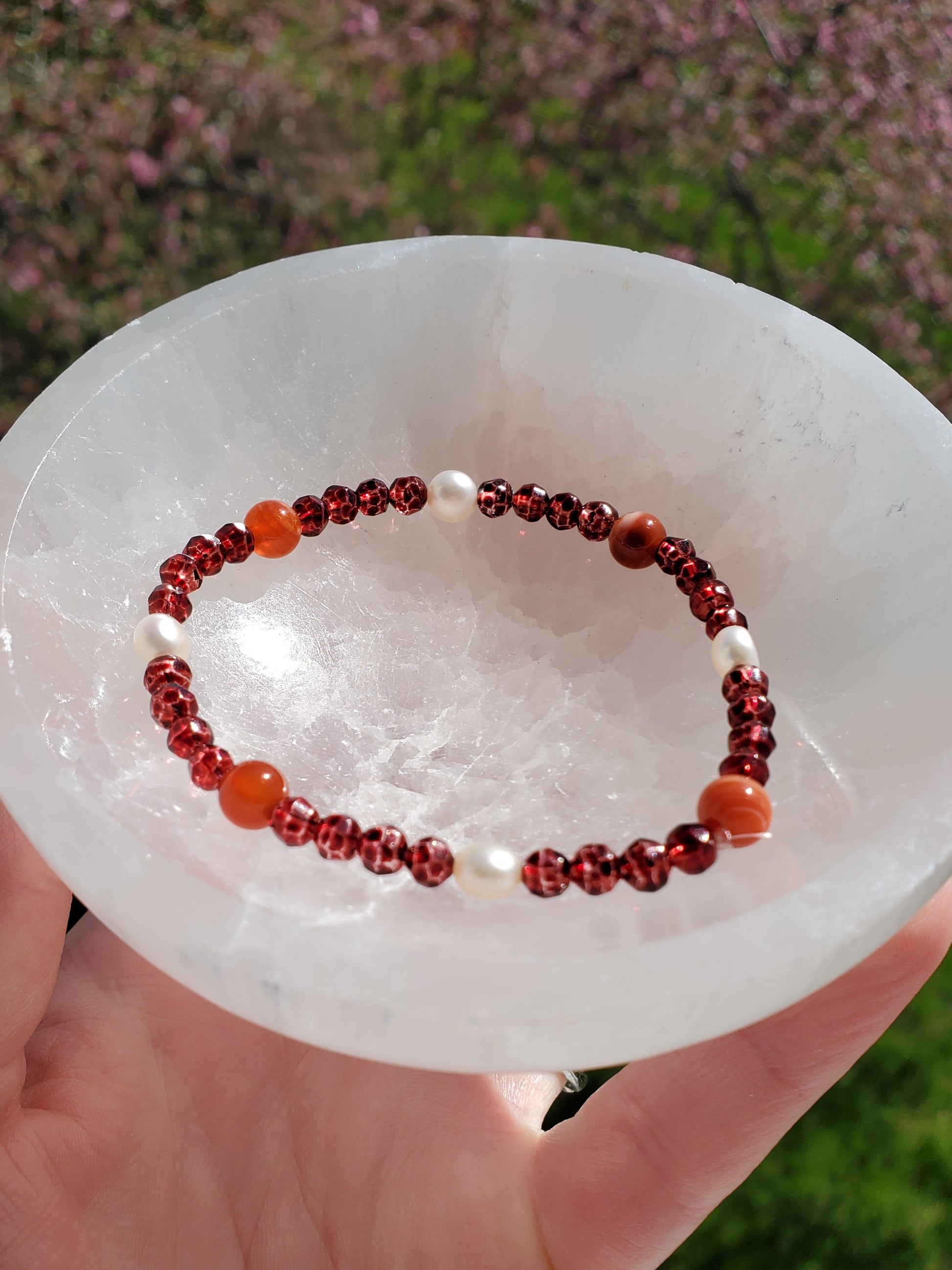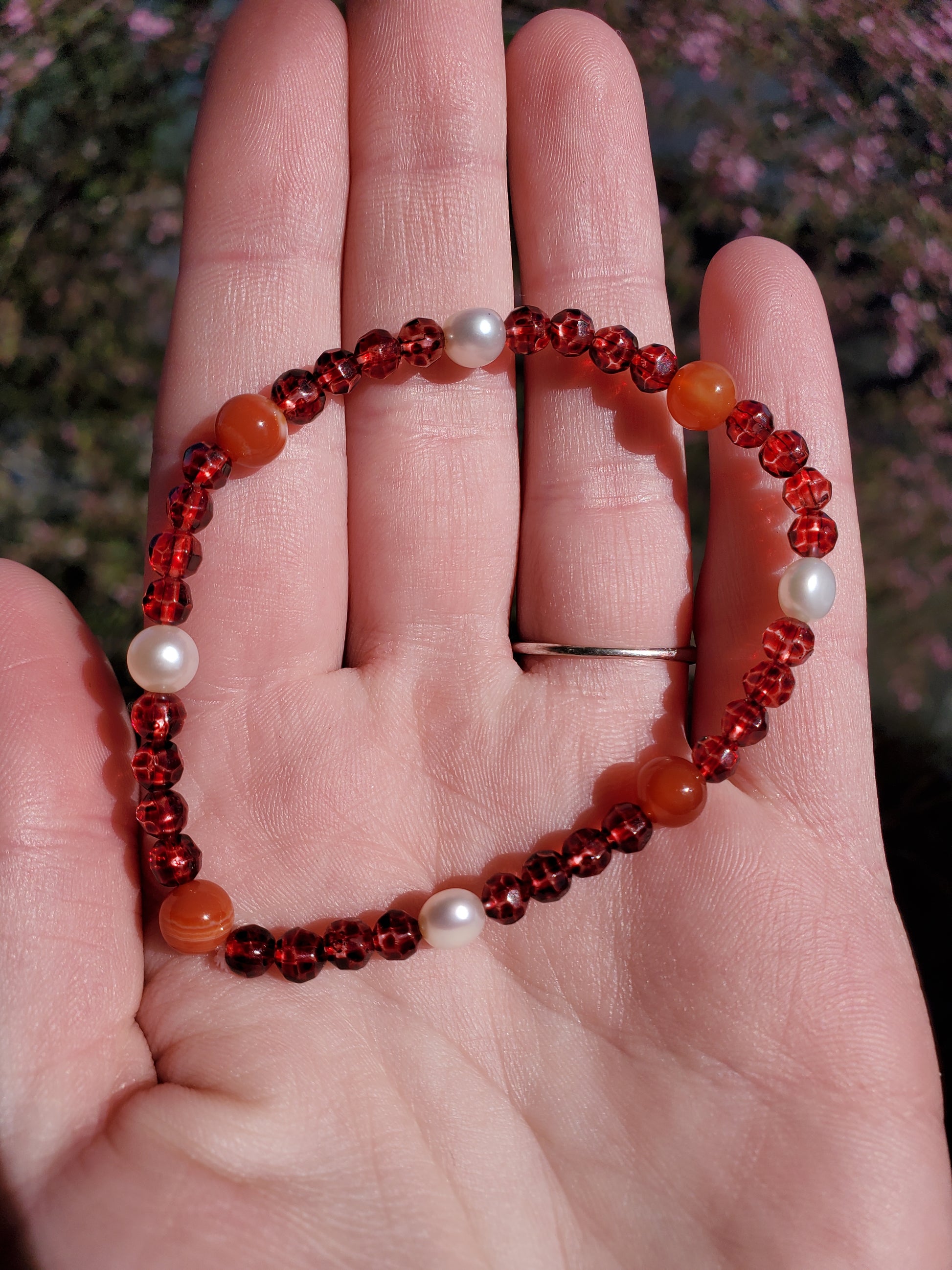 A combination perfect for root chakra work. Cultivate your self-trust while staying grounded. The pearls - being a water associated gemstone - cool down the fire-like energy from the garnet & carnelian.