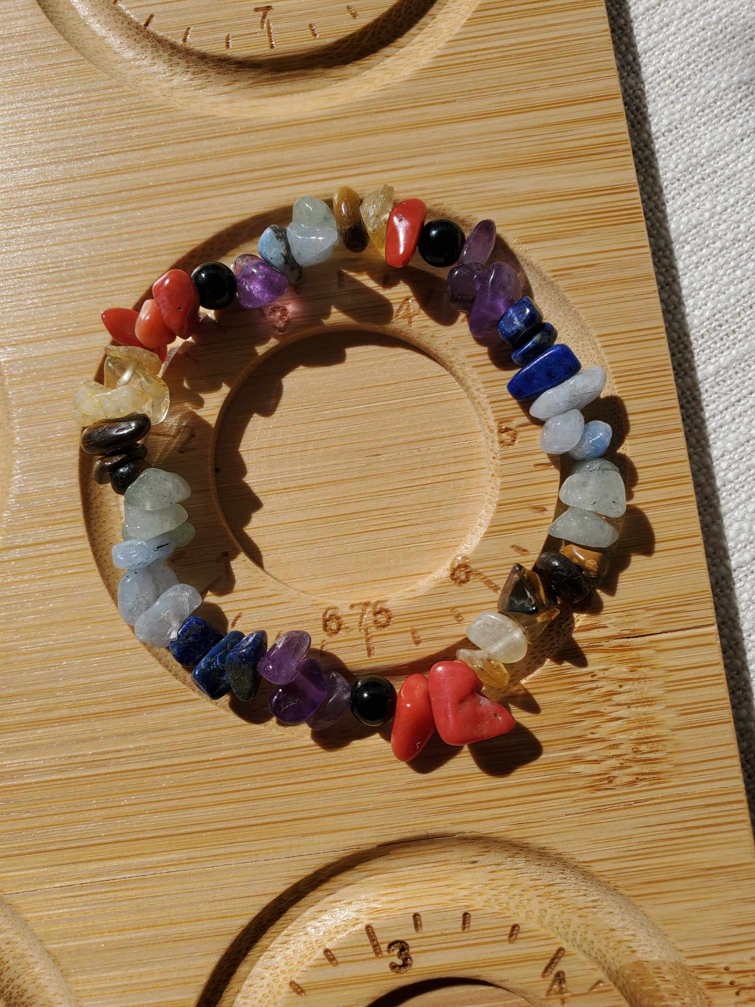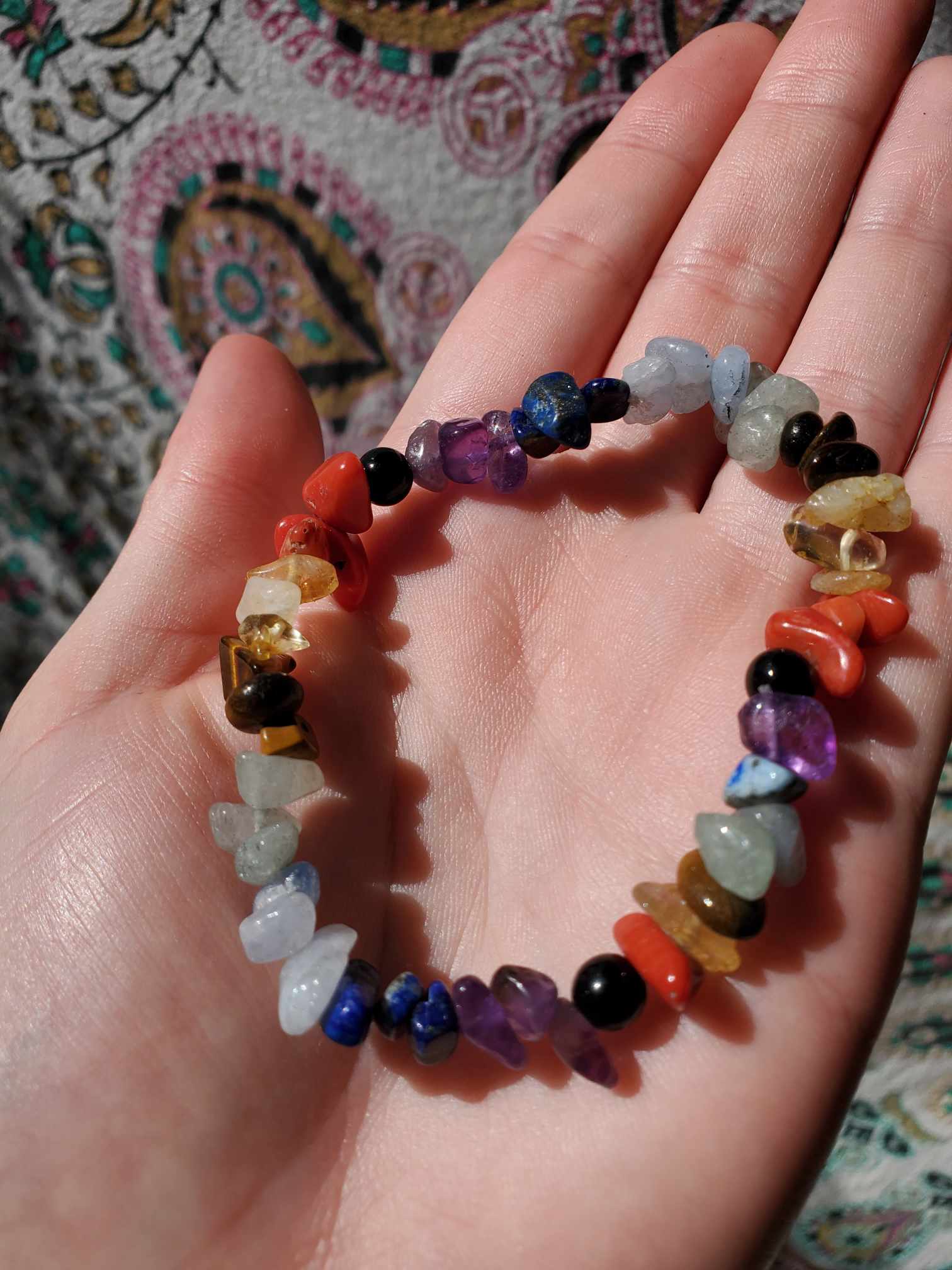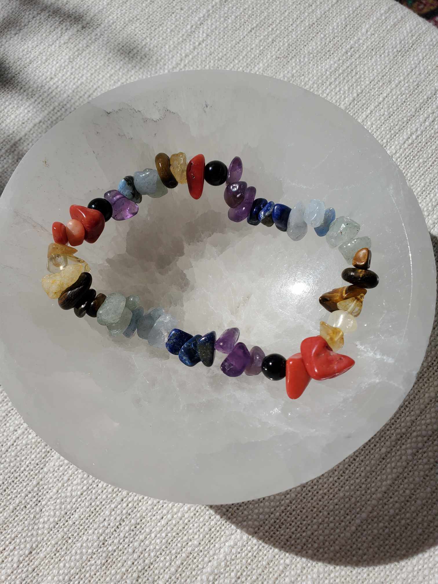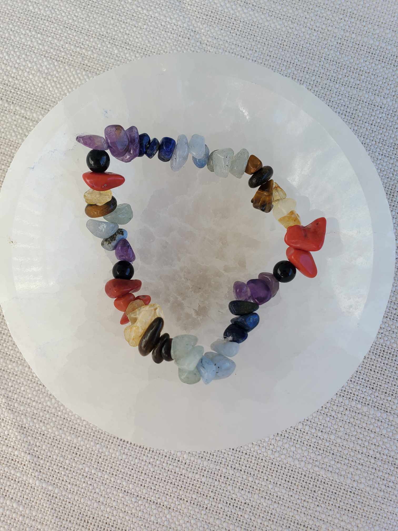 Root- Red Coral; Sacral- Citrine; Solar- Tiger's Eye; Heart- Aventurine; Throat- Aquamarine; Third Eye- Lapis; Crown- Amethyst; Protection-Obsidian