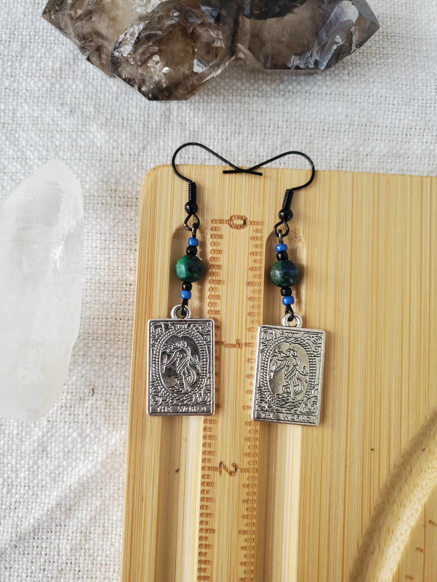 Pairing these together just makes sense. Chrysocolla is representative of both the earth & the water here on Gaia. Stimulating the throat & heart chakra simultaneously, chrysocolla helps improve communication, ease anxiety around public speaking & helps thaw out freezer burnt emotions. The World Major Arcana can represent integration & accomplishment.