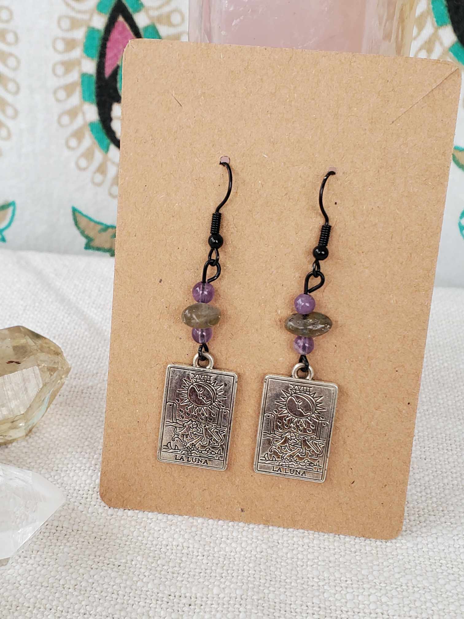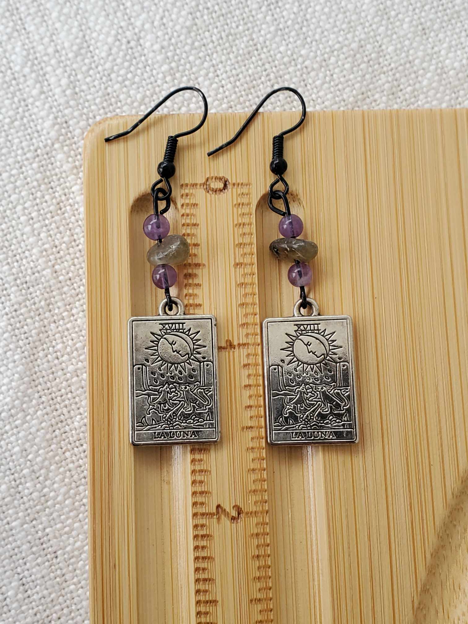 Beautiful & peaceful "The Moon" Tarot earrings, crafted with amethyst & labradorite. This combo works well for the crown chakra, filling that area with calming energy.