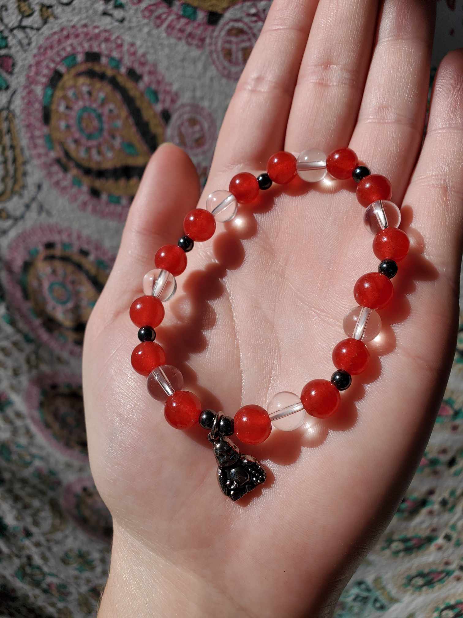 Allow the stabilization of jade to be accentuated by the clear quartz and hematite it is paired with here. Peace, protection, power. In order to help center others, you must first be centered.