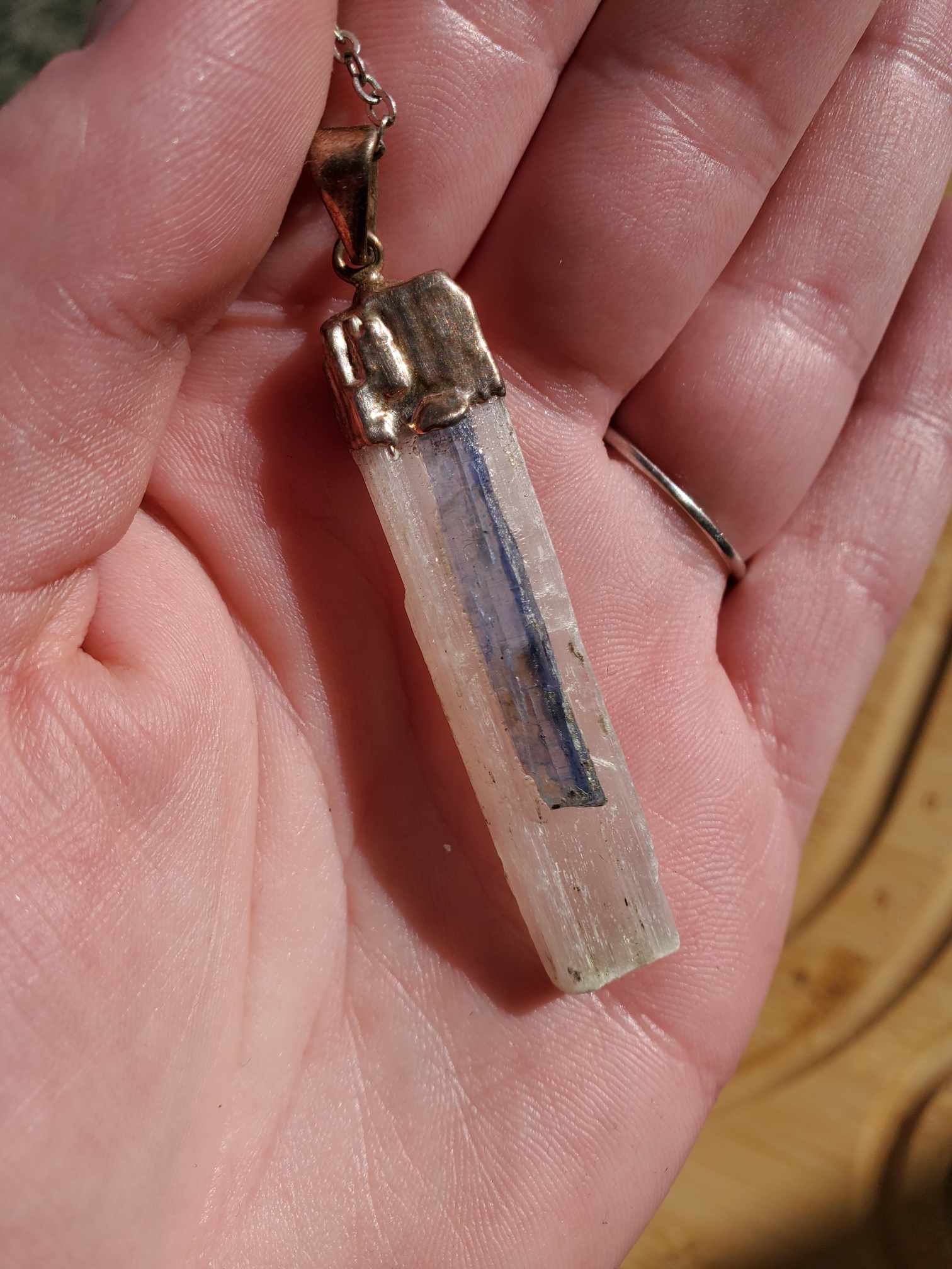 Stay cleansed (selenite) and connected (kyanite) with this piece. Kyanite accent pieces wrapped & connected by hand. *Pendant itself not created by Manifested by Mars.