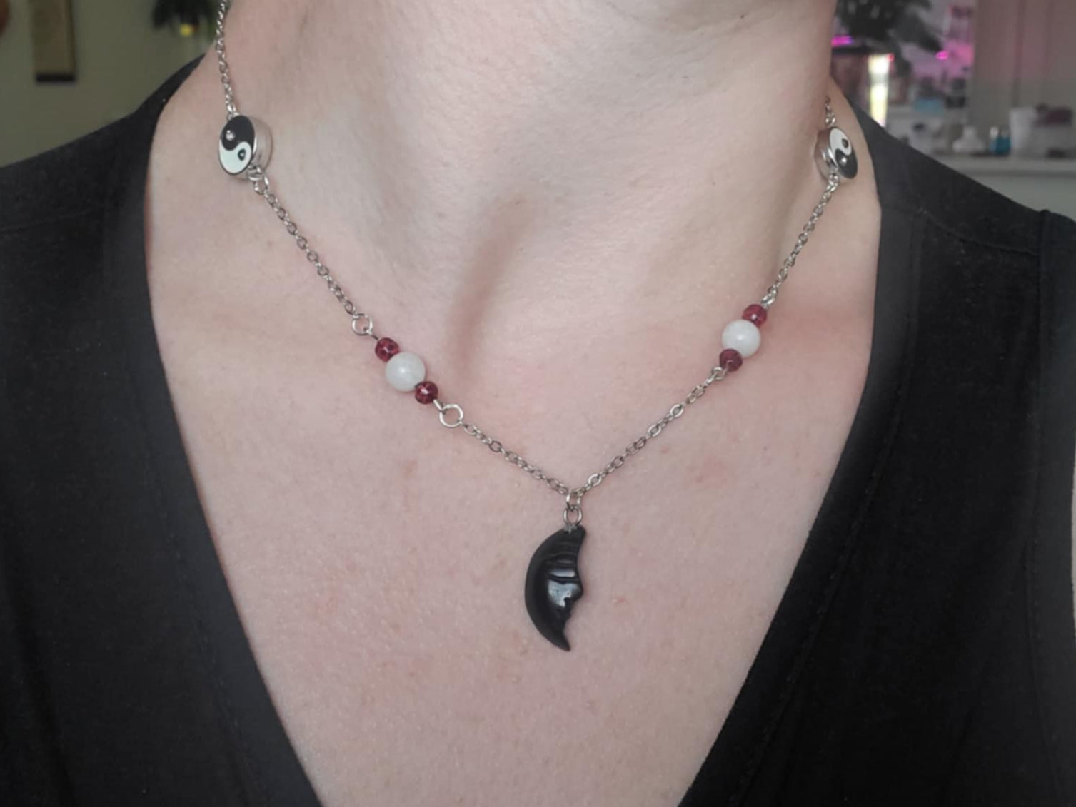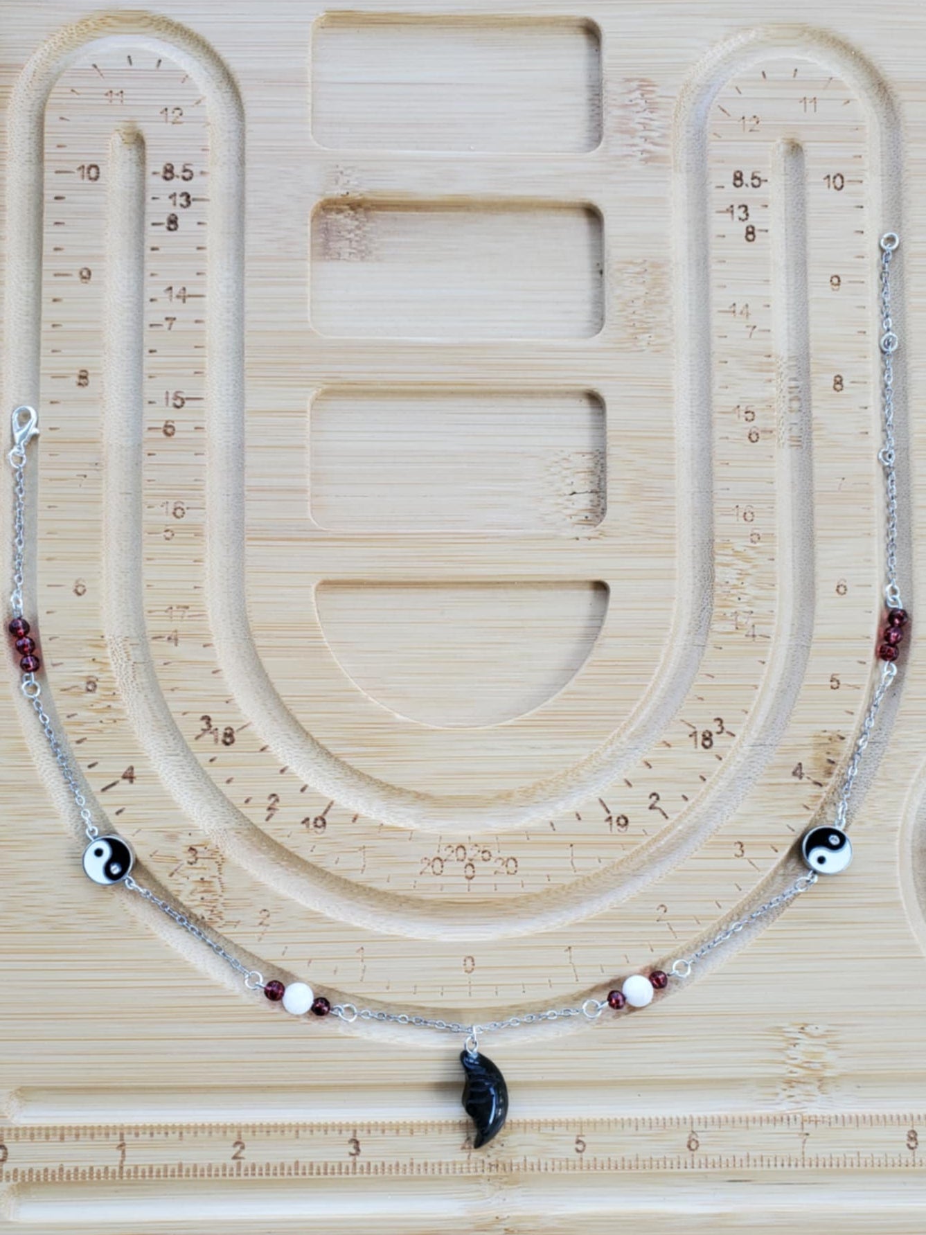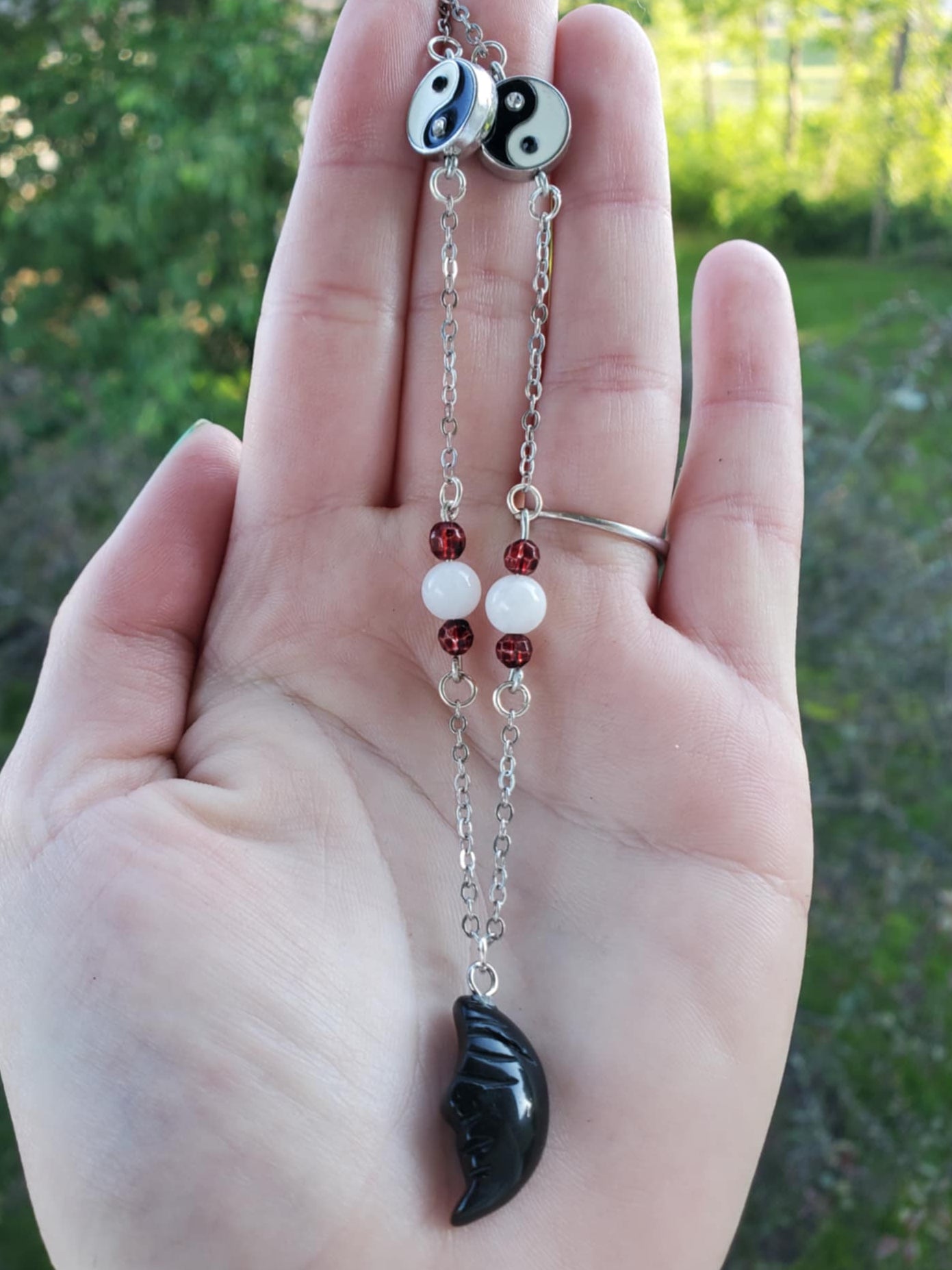 Inspired by the "dark night of the soul" that so many of us face. Obsidian helps you stay grounded, garnet reminds you of your TRUE internal power, and moonstone holds you while you navigate your emotions. The yin-yang symbol is a reminder that even in the darkest nights of the soul, the light shines through.