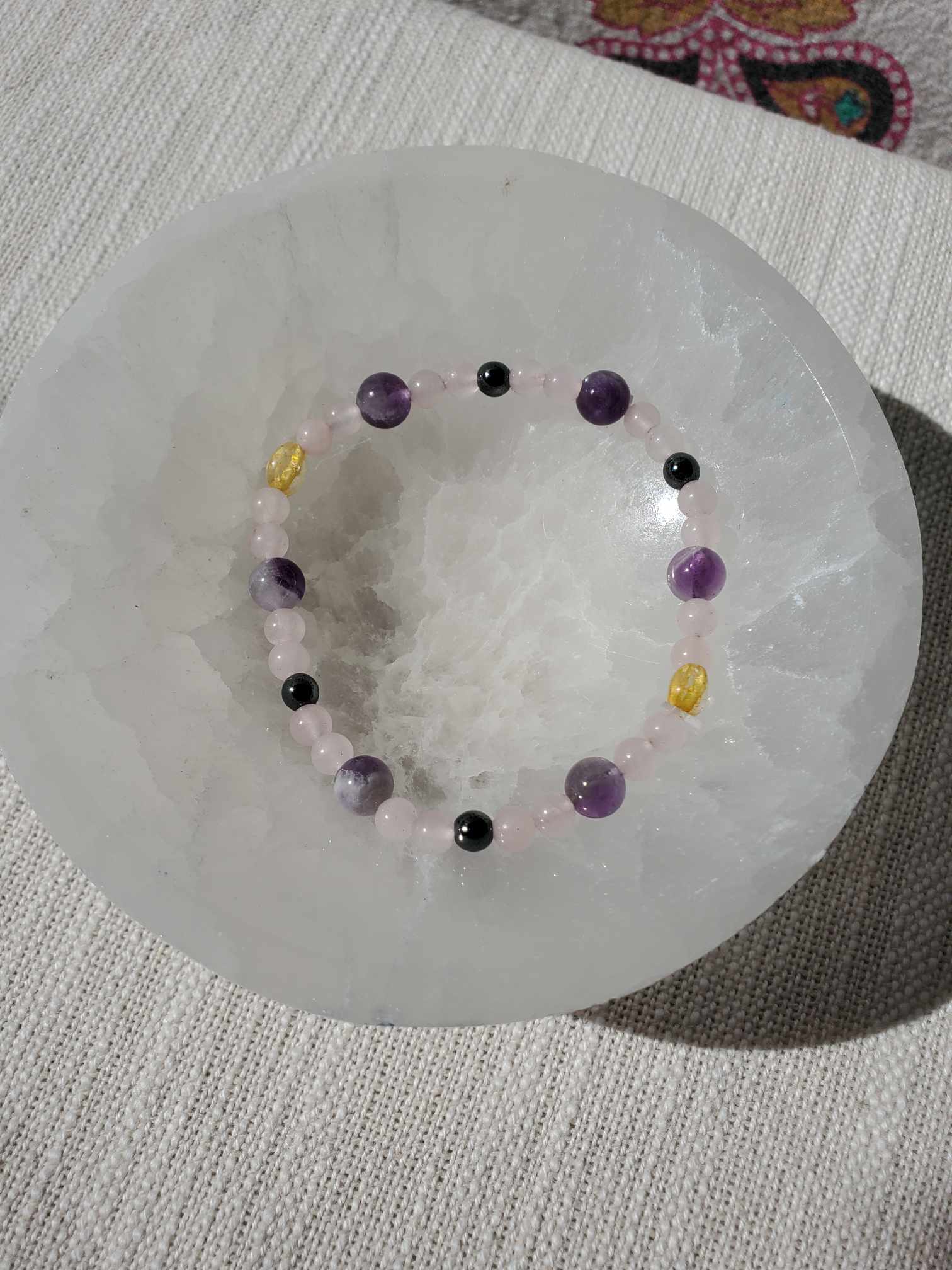 Empathetic balance; feel it all! Keep yourself open to receiving through the top chakras with amethyst, the heart with rose quartz, and the creative energy flow with citrine. Hematite will absorb and deflect and residual negativity.