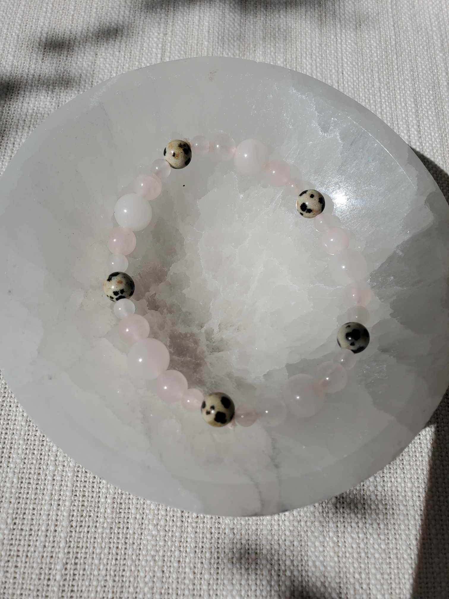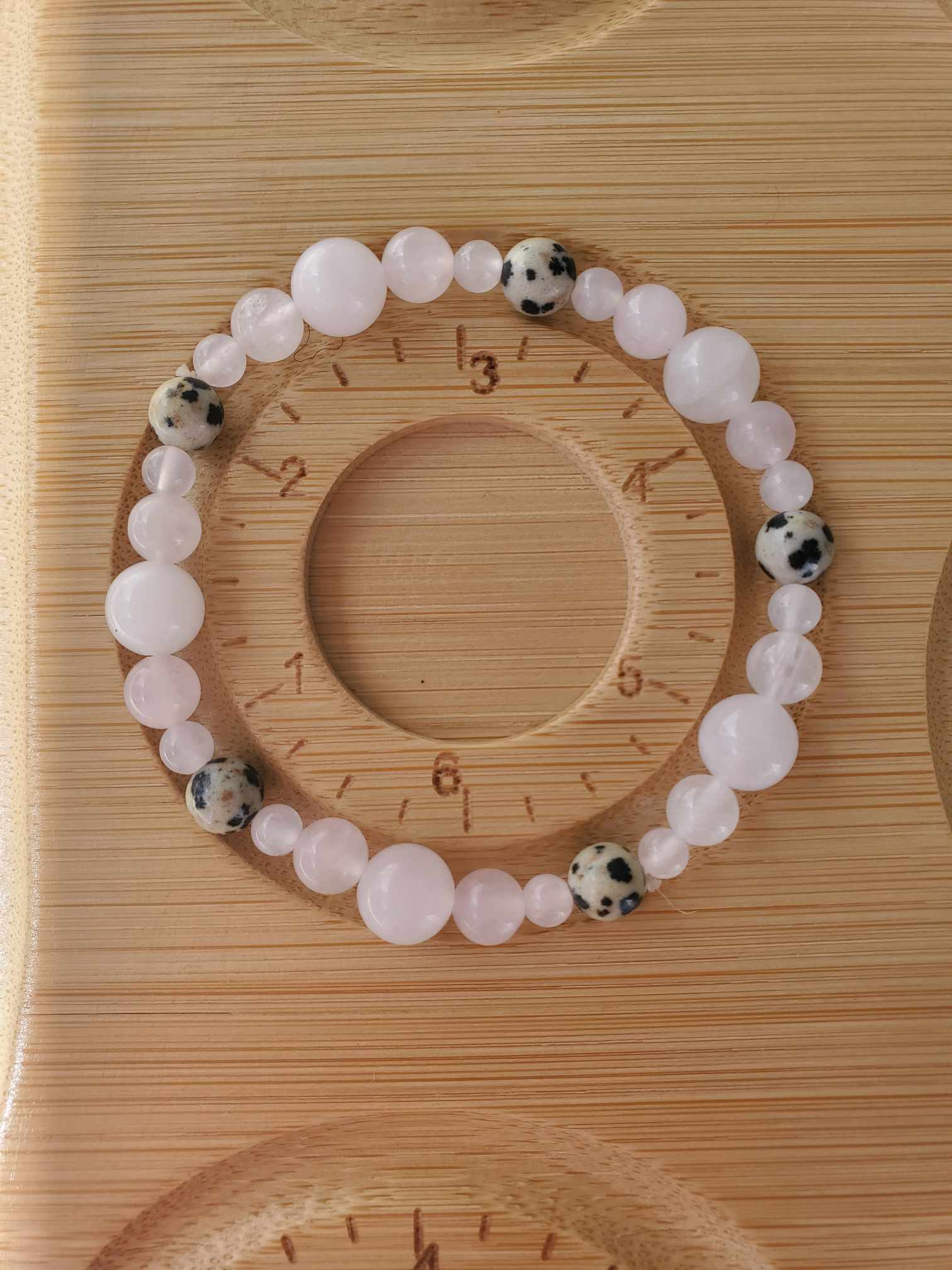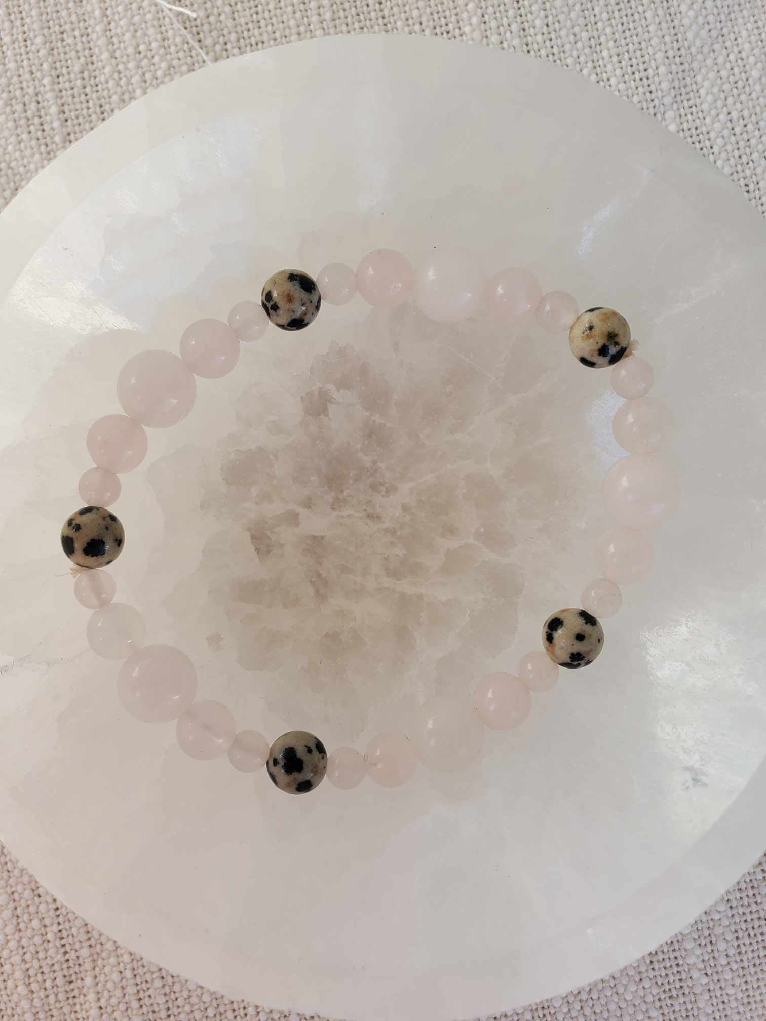 A great combination for someone in a demanding leadership position. Rose quartz keeps the heart chakra open and understanding, while dalmatian jasper grounds and encourages teamwork. Also a lovely bracelet for any kind of personal problem solving.