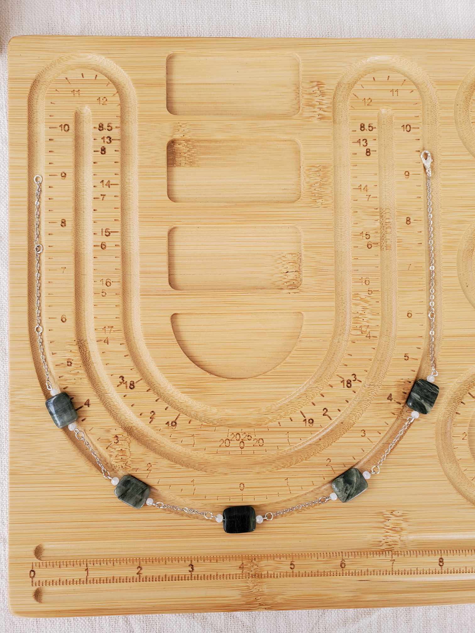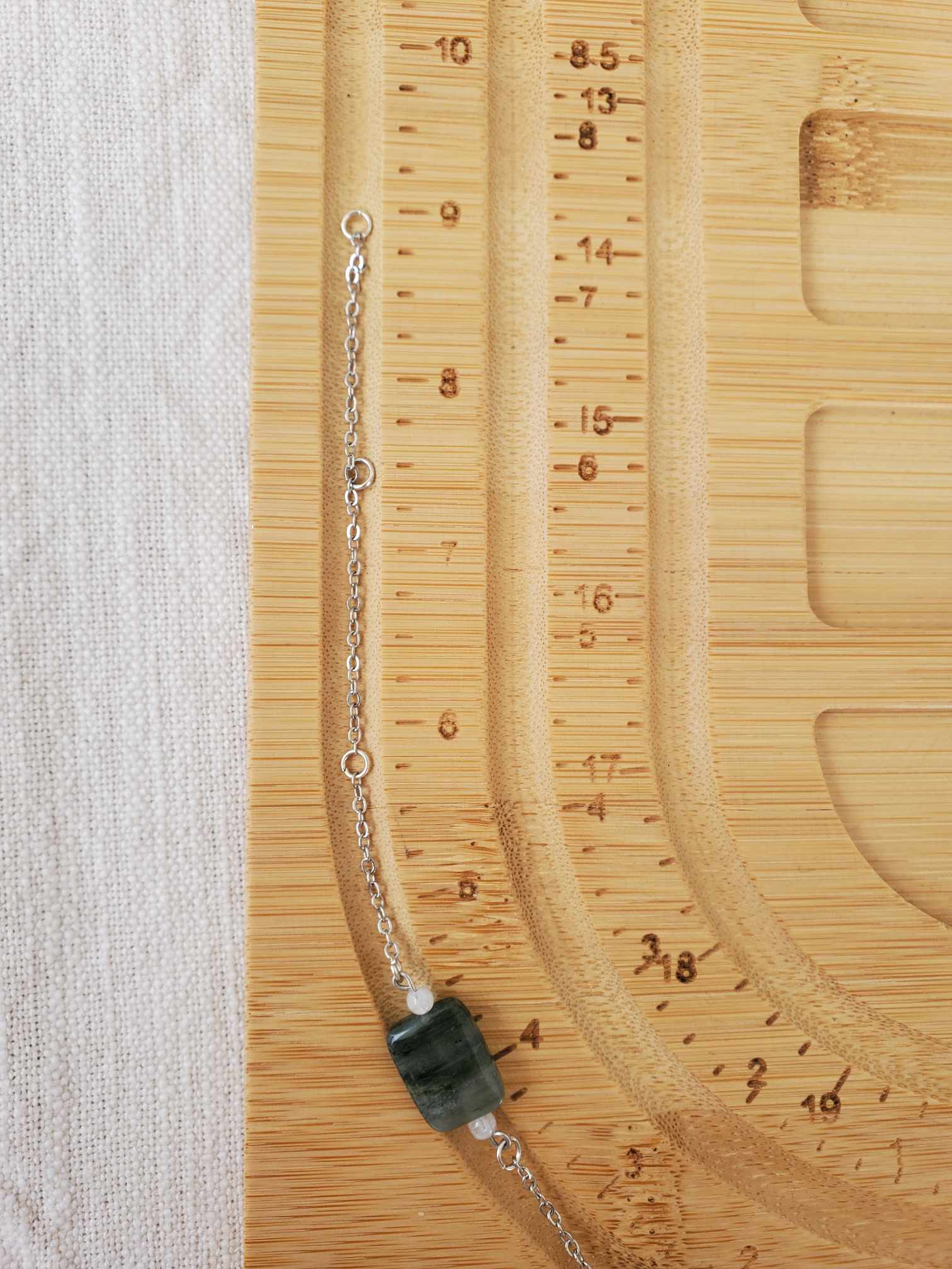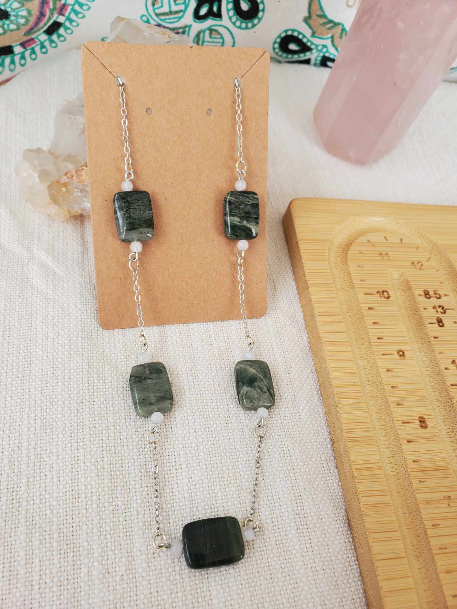 Seaweed Jasper & Moonstone create a calming, nurturing energy. It is especially beneficial to women stepping into the connection with Mother Earth.
