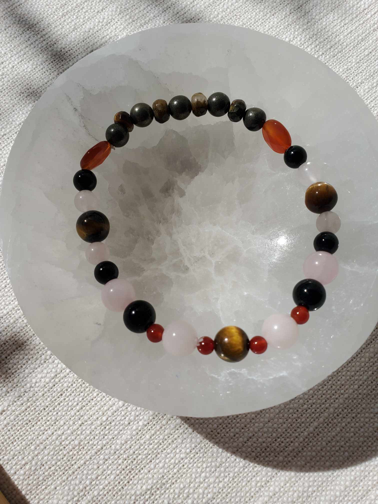 Obsidian- Spiritual Protection; Tiger's Eye- Physical Protection; Pyrite- Financial/Mental Protection; Rose Quartz- Worthiness; Carnelian- Kundalini Power of the Self